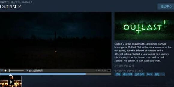 由于潜入式动作RPG游戏《逃生》的成功,续作《逃生2(Outlast 2)》也是备受玩家的关注与期待。去年,《逃生》的开发商Red Barrels也正式公开了本作。在经历了长时间等待之后,现在,这款游戏终于登陆Steam页面。