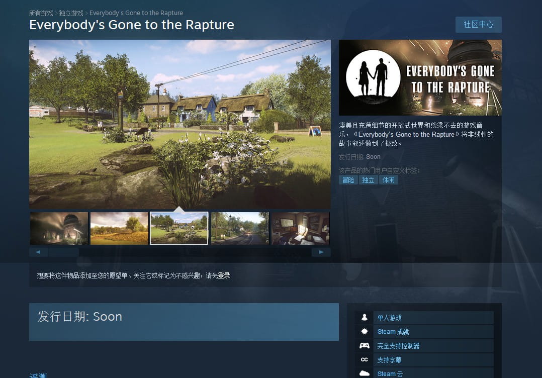 《万众狂欢》是由《失忆症》的开发商The Chinese Room所制作的灾难题材的冒险游戏,以世界毁灭作为开头,第一人称视角和简单的游戏机制来进行探索使得游戏更有临场感。该游戏原本为PS4独占,此前游戏曾经出现在了Steam的游戏库里,之后又有一则来自AMD显卡的更新日志,证明了游戏确实会登陆PC平台。现在游戏在Steam商店已经有了相应的商店页面(需要正确上网方法)。